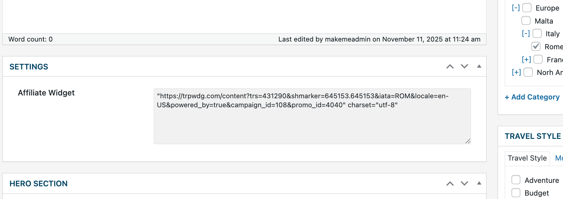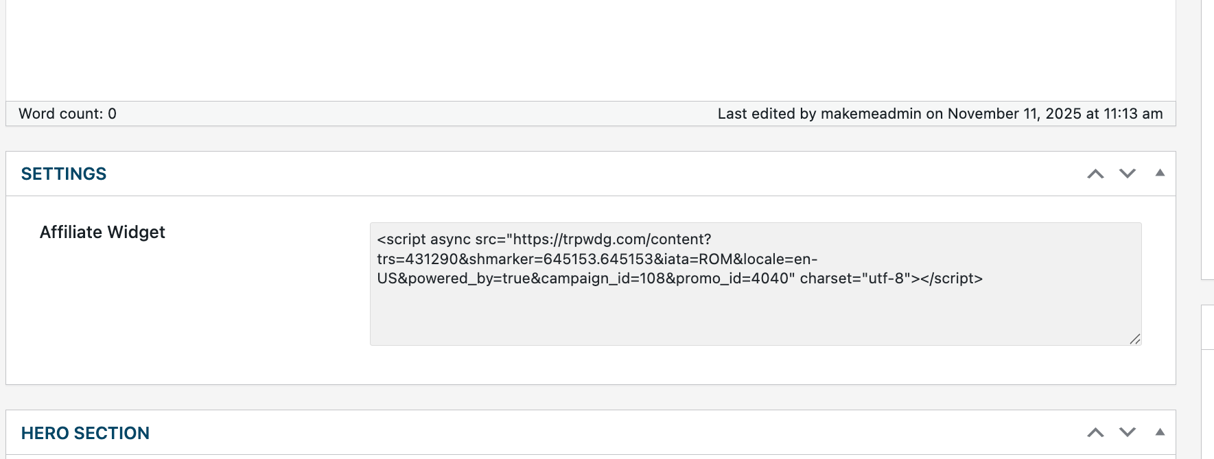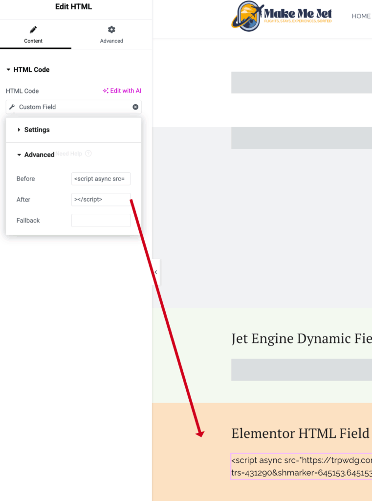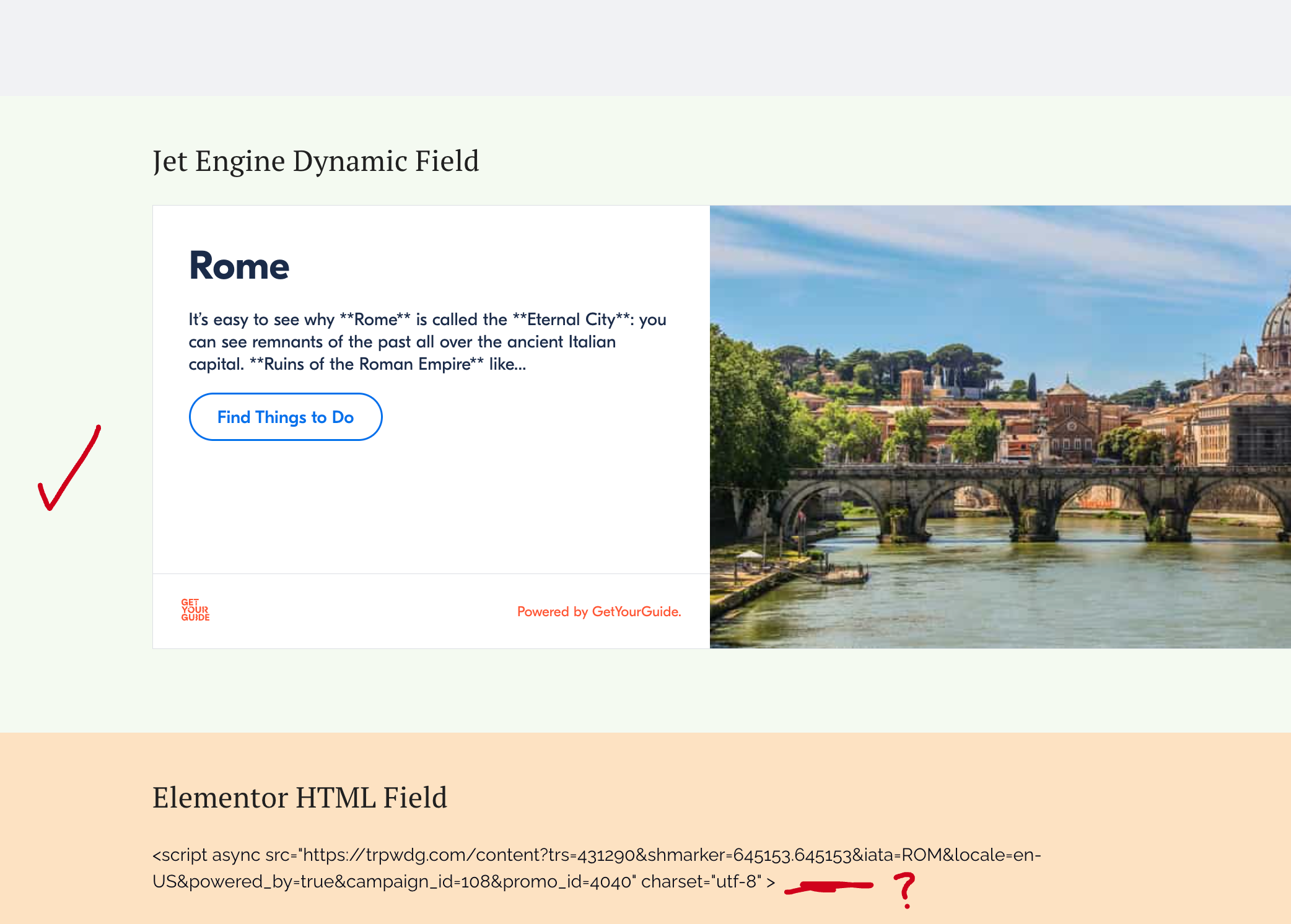 You’ve got dynamic data in JetEngine—like an affiliate widget or a booking script—that changes per post (Rome, Paris, London).