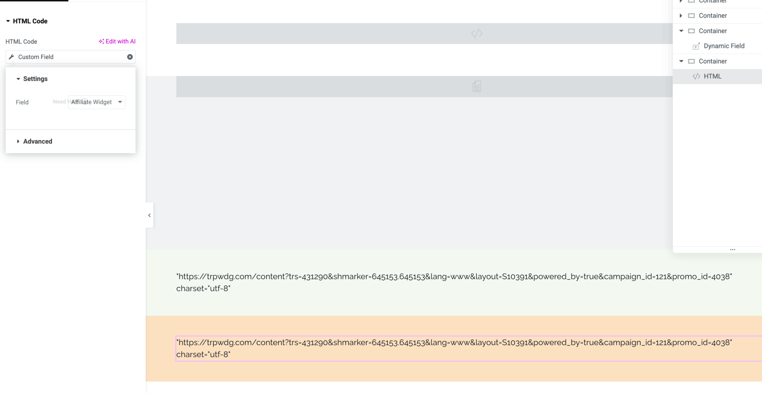 Attempt 2: Using Elementor HTML widget with Dynamic Tag → blank.